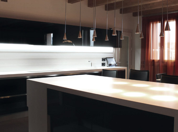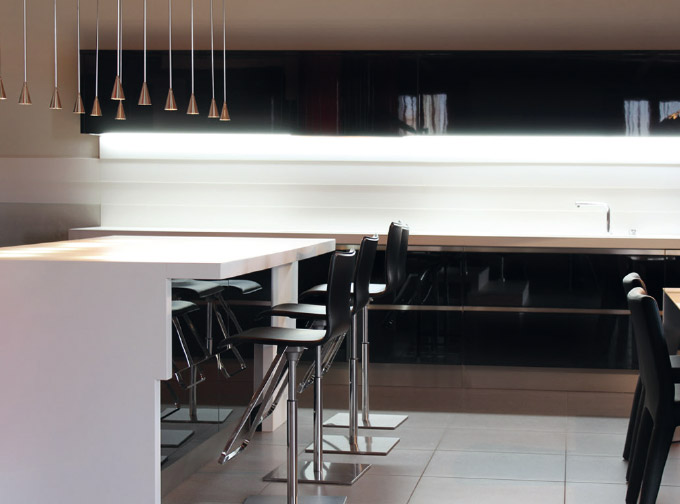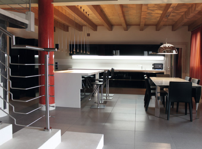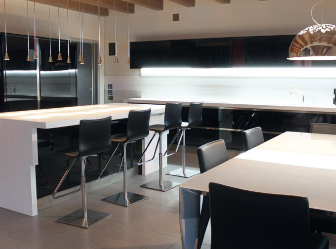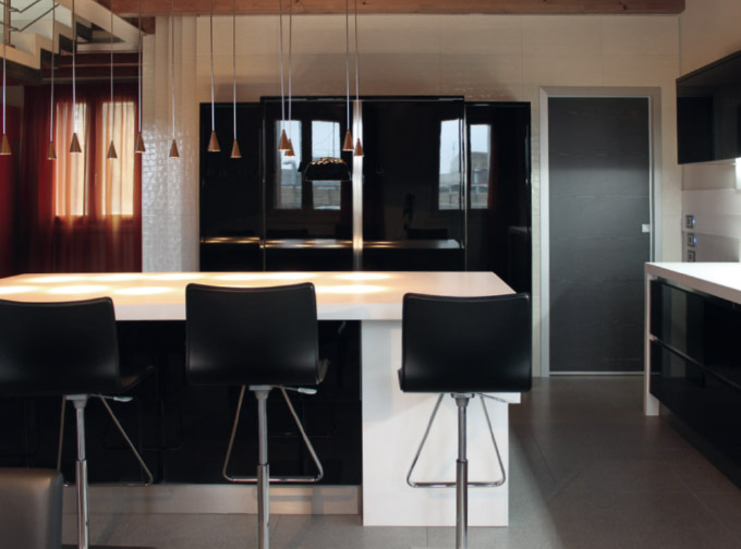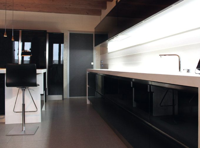 La sapiente maestria dell’architetto Carlo Zecchin di Cologna Veneta (VR) ha trasformato la cucina in un luogo pieno di effetti luminosi e dove tutto si specchia su superfici nere lucide trasformando l’ambiente in un locale elegantissimo e pieno di vitalità. I giochi di profondità sulle colonne, negli elementi del bancone e nell’alzata tra base e pensili le conferiscono una personalità unica. Nasce sulla base del mod. +02 minimal ed è stata personalizzata solo nella lunghezza dei pensili.
